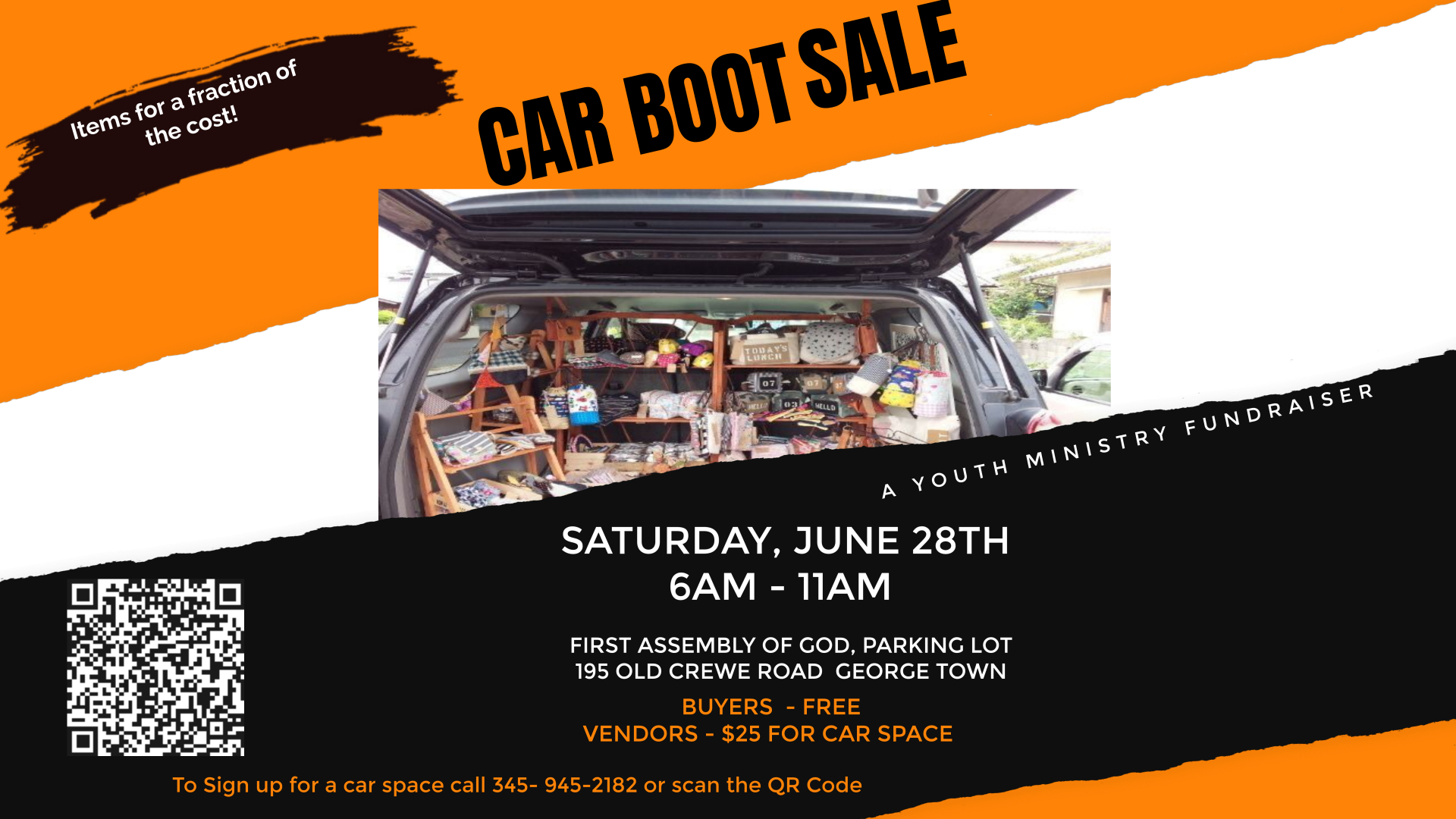 Join us for our Youth Ministry Carboot Sale on Friday, June 28, from 6:00 AM to 11:00 AM at First Assembly of God parking lot!